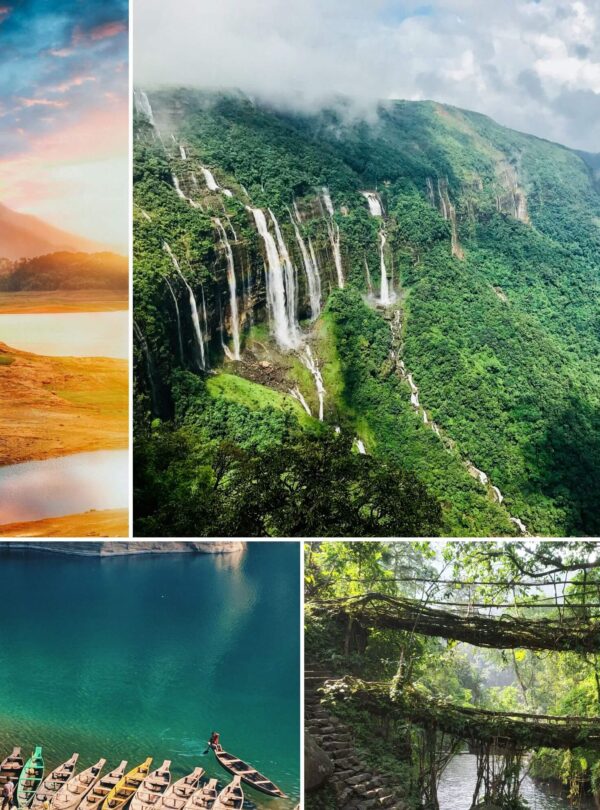 Hidden in Northeast India lies Meghalaya — a land of emerald hills, roaring waterfalls, living root bridges, and rivers so clear they look unreal. From the musical vibes of Shillong to the pristine charm of Mawlynnong and Dawki, every corner feels pure, raw, and magical.